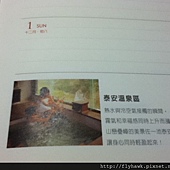 這是一月的開始頁。光看那個泡湯就很想再去泡....離題了。這本行事曆採一周兩頁的設計,每個月都有自己的花卉,如一月是油菜花,三月是櫻花。每周的下面都會稍微介紹苗栗的觀光景點,或特殊習俗飲食(二三月有介紹到紅龜粿和火旁(ㄅㄤˋ )龍的傳統文化)。當然,每月的開始頁後面也有月行事曆。